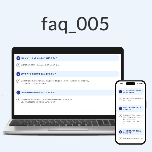 faq_002の構造をベースにしたアレンジ版デザイン。 アコーディオン型で質問をクリックすると回答が開閉する仕組みはそのままに、右側の+−マークを非表示にしたスッキリ仕様です。 スマホユーザーが大半を占める業種に特におすすめ。 +−マークを省くことで、質問文を横いっぱいまで表示でき、可読性が大きく向上します。 質問には「Q.」、回答には「A.」がbefore要素で自動表示され、faq_002同様に回答部分のインデント調整や余白設定も最適化済み。 もちろん、DRESSから文字サイズや配色、背景カラーなども自由に調整可能です。 ミニマルで読みやすく、スマホでの表示にも配慮されたFAQ構成を求める方にぴったりの一案です。 ■BlockDesignのページは下記から確認できます https://bindism.com/blockdesign/faq/faq_003.html ■利用規約を必ずご確認ください。ご購入は規約に同意いただいたとみなします。 https://bindism.com/blockdesign/terms.html