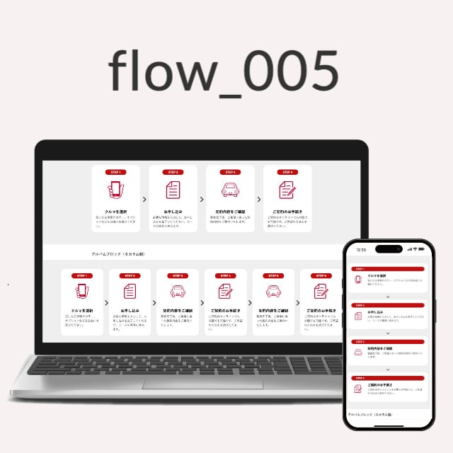 サービス導入や申込みの流れを**整った印象で伝えられる**、囲みSTEP付きのフローデザイン。