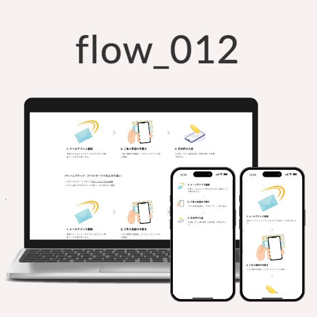 **BlockDesign「flow_012」**は、横から流れ込むアニメーションと、デバイスごとの最適レイアウトで「順番」をわかりやすく示します。